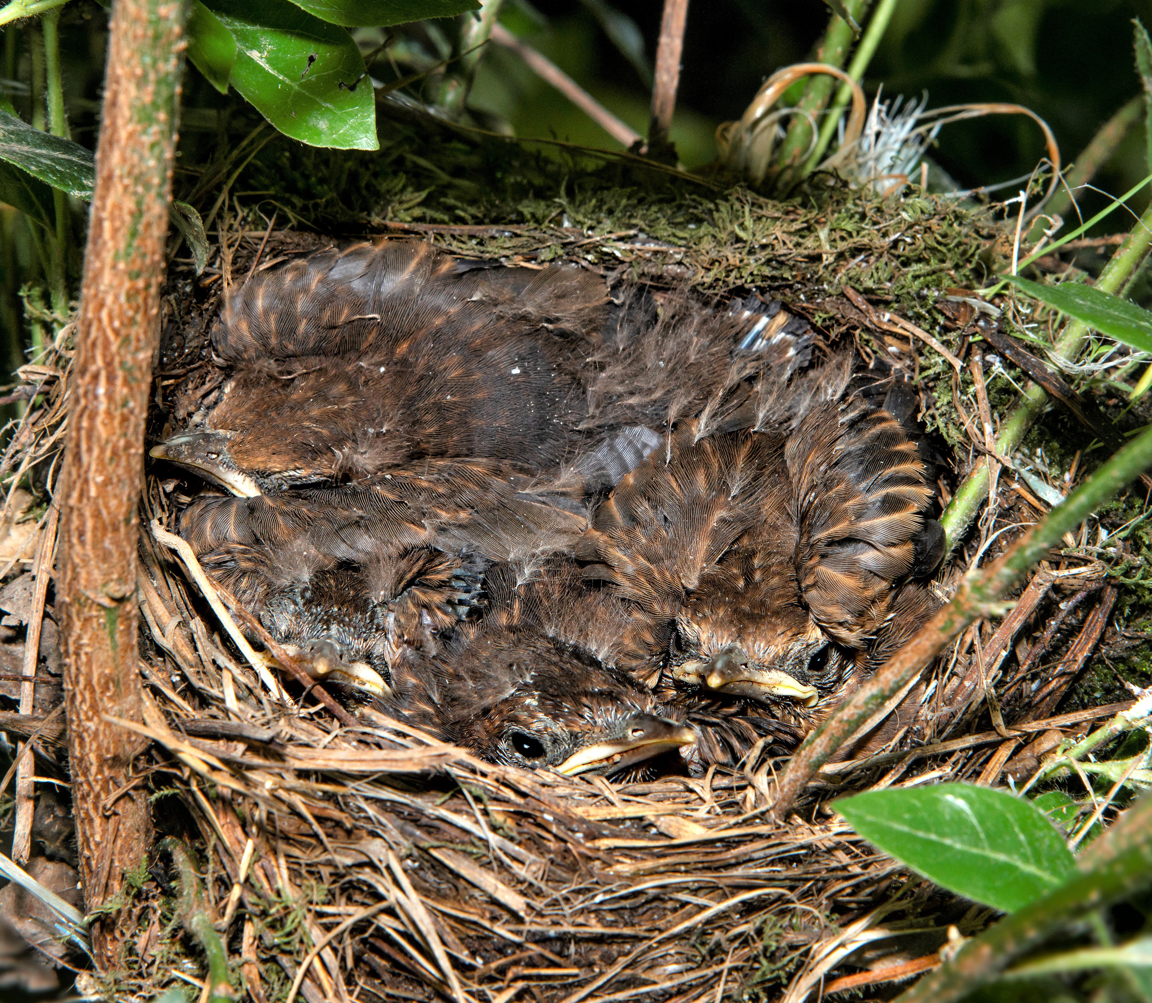 I merli portano a termine due o addirittura tre nidiate all’anno, da marzo a giugno, con tre o quattro pulli per nidiata, per compensare la forte mortalità dei piccoli.